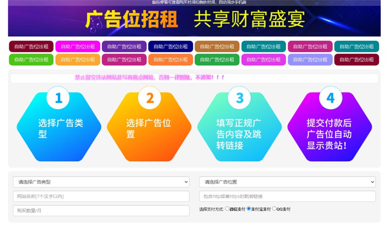 自助购买大横幅,小横幅,文字广告,后台可设置每个广告位的不同价格,颜色,宽高,自由增加修改广告位数量