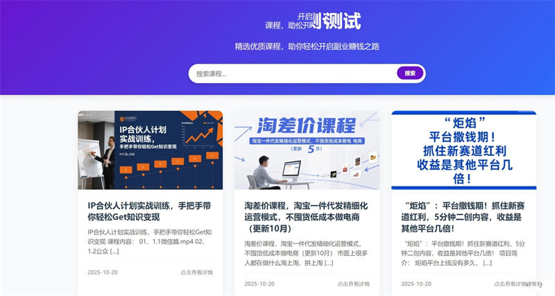 这是一款html自动更新网赚单页源码,是通过WordPress REST API自动获取最新课程内容,无需更新维护,系统自动完成内容采集和更新,内容更新即时反映在平台上,当然有技术的可以对接自己的API,里面是别人的API,也不一定什么时候链接就死了,喜欢的自行部署吧!