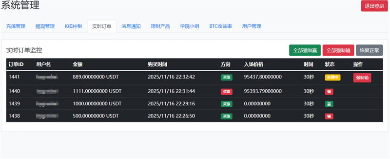 主要测试了k线行情控制、用户输赢控制、订单输赢控制,非常好用,各个功能都正常,还有代理功能