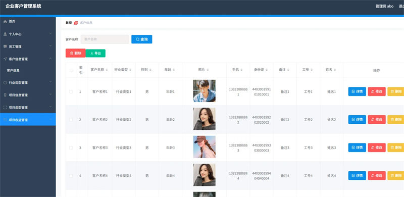 企业客户管理系统的主要使用者分为管理员和员工,实现功能包括管理员:首页、个人中心、员工管理、客户信息管理、行业类型管理、项目信息管理、项目类型管理、项目收益管理,员工:首页、个人中心、客户信息管理、项目信息管理、项目收益管理等功能。由于本网站的功能模块设计比较全面,所以使得整个企业客户管理系统信息管理的过程得以实现。