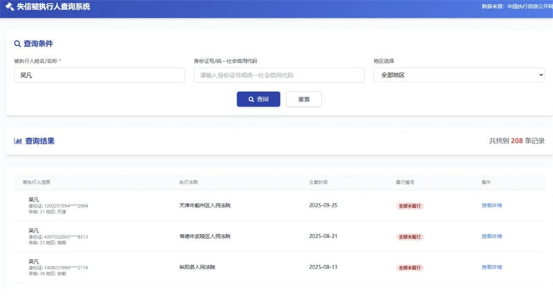 1. 提供多种查询方式(姓名/名称、身份证号/统一社会信用代码、地区筛选)