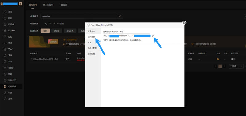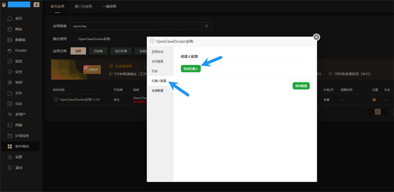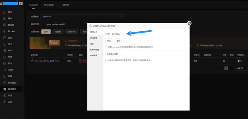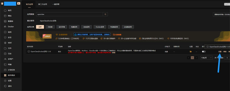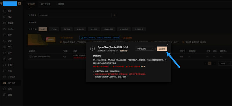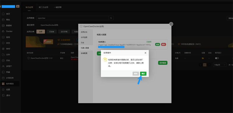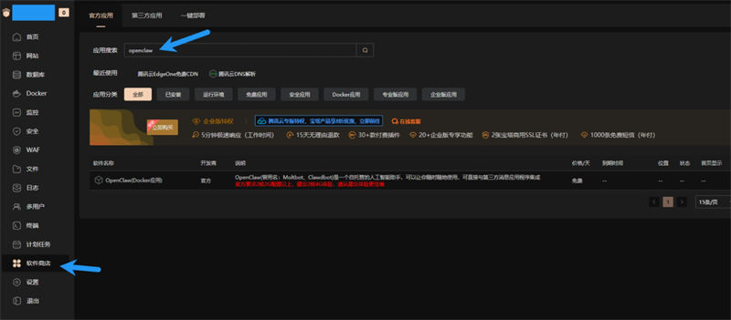 安装完成后,点击软件商店,搜索 openclaw ,点击安装