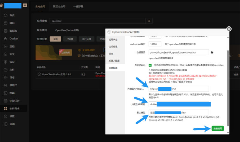 根据自己的实际情况,填写相关信息,点击安装应用(这里我要使用的是前面教程反代出来的自建 API,如果你有其他官方 API,请自行设置接入,这里不做赘述)( 大模型API地址 为自建项目的 服务器IP:端口 或是为项目反代的 域名(结尾一定要带/v1);大模型API密钥 为在自建项目里创建的 API Key ;默认模型 为在自建项目里获取到的模型名称,选择其中一个)