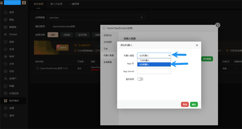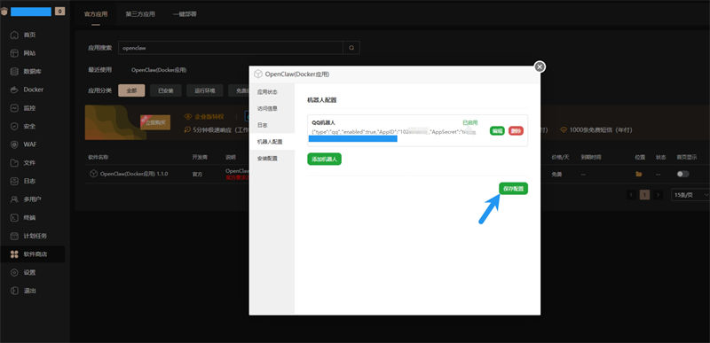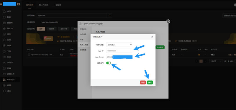 回到宝塔面板,填入上面复制的 App ID 和 App Secret,点击启用,点击确定