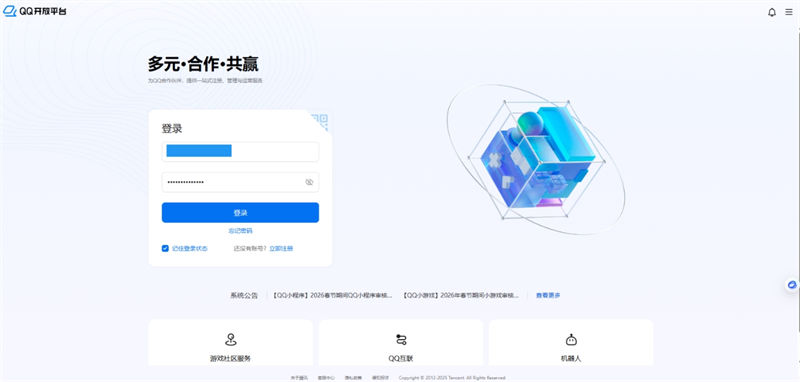 访问 QQ 开放平台 https://q.qq.com/ ,如果你尚未注册过,需要先注册账号(需要实名信息,扫脸,以及一个 QQ 号作为管理员 QQ 号),非常简单。