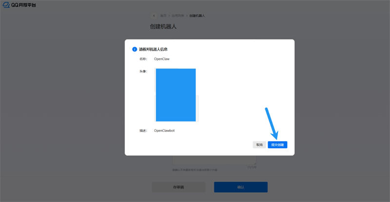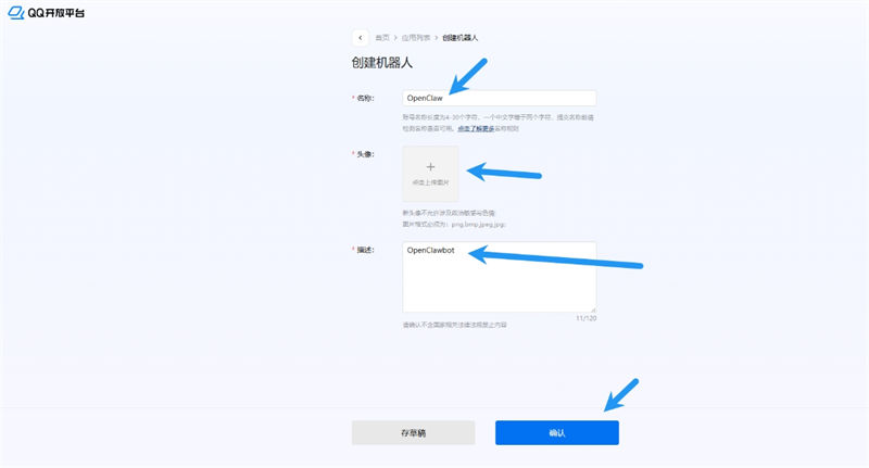 填写机器人名称,上传机器人头像,填写机器人描述,点击确认