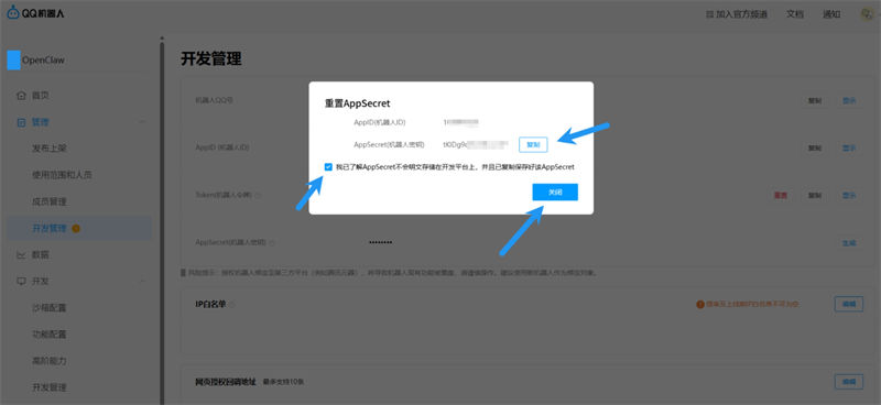 扫码认证后,复制 App Secret,勾选,点击关闭