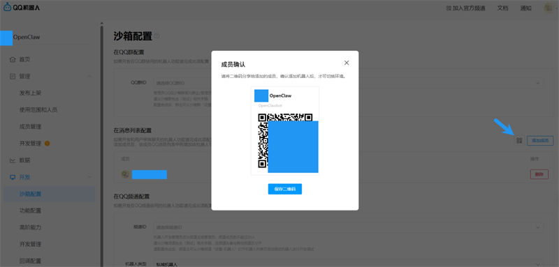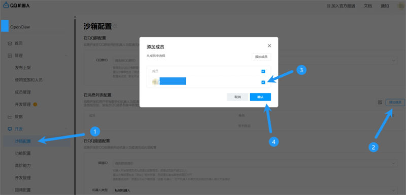 点击沙箱配置,点击添加成员,把自己勾选上,点击确认