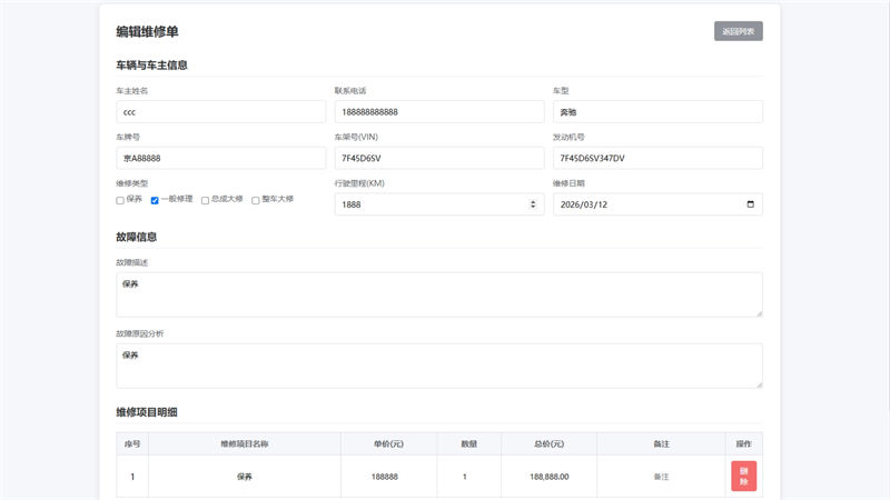 汽修单管理 2.0 系统,专为中小汽修门店打造的轻量化管理工具。它能帮你高效管理维修订单和客户信息,从车辆信息录入到故障分析、费用统计,全程数字化流转,告别纸质单据和混乱台账。系统界面简洁直观,操作零门槛,同时支持按用户、按日期精准查询,让每一笔维修记录都清晰可追溯,全面提升门店运营效率与客户服务体验。